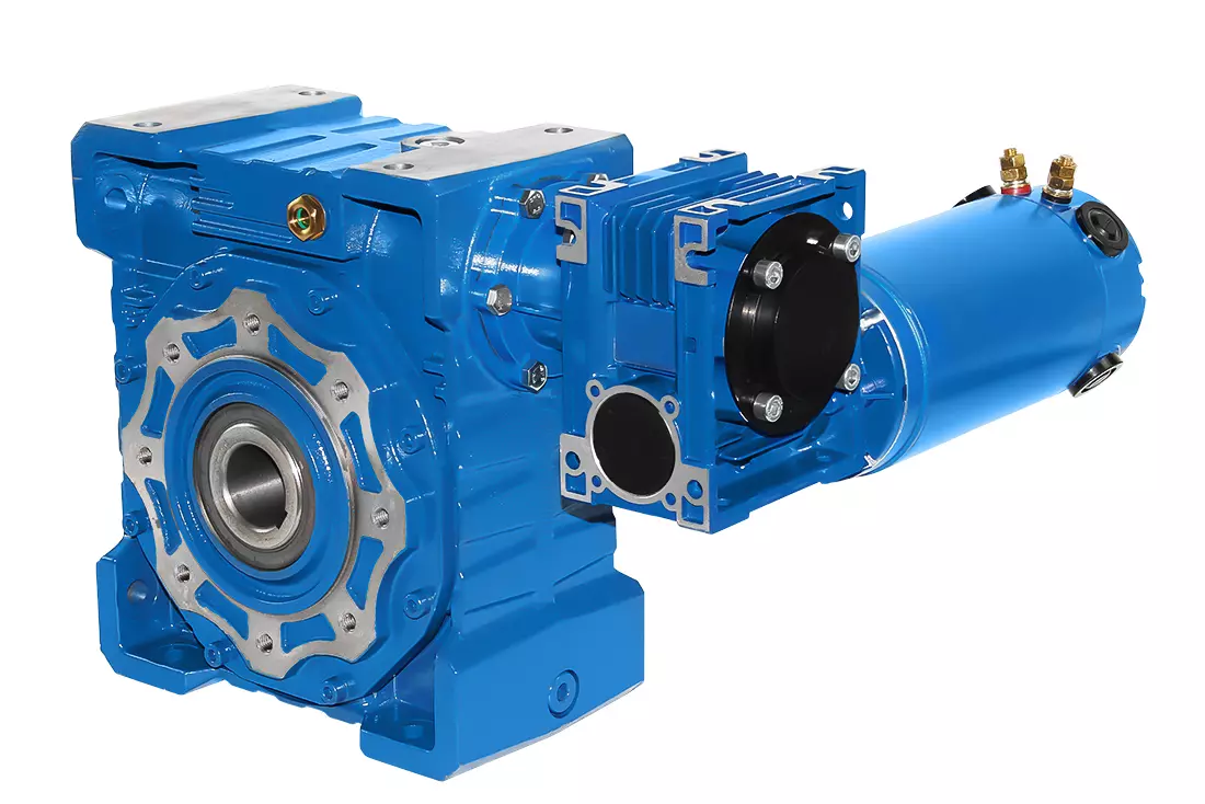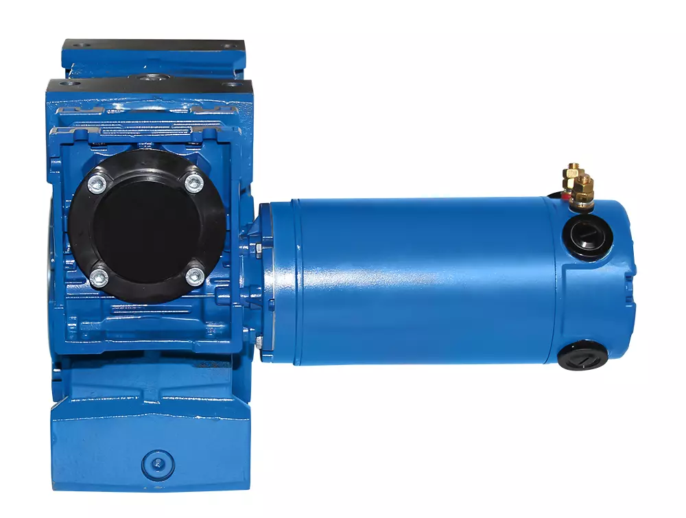 Dubbele wormwieloverbrenging met DC-motor, IP40, Vermogen = 0,8 kW, Snelheid = 7,0 tpm